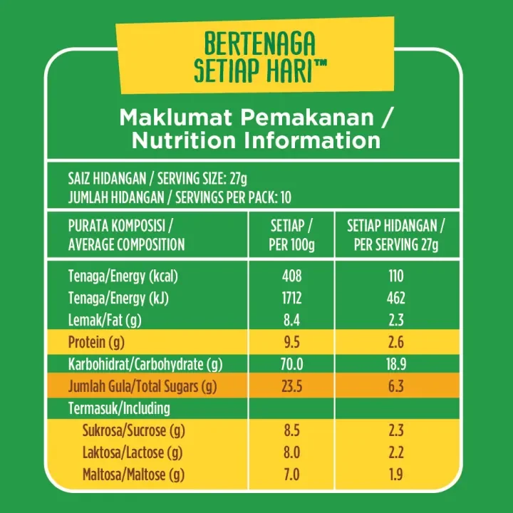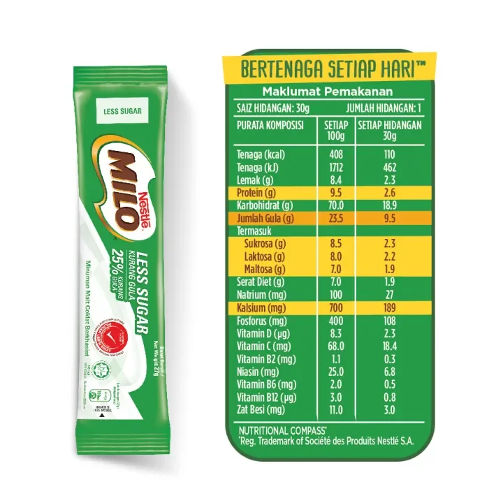 MILO® Less Sugar mengandungi kalsium yang tinggi yang boleh membantu mengekalkan ketumpatan tulang dan sumber protein yang baik untuk pembaikan otot dan tisu akibat haus dan lusuh harian! Sudah tentu ia penuh dengan tenaga berkhasiat MILO® yang dibuat dengan kebaikan barli malt, susu, koko, dan vitamin dan mineral penting untuk memastikan anda sentiasa bertenaga. Dirumus dengan 25% kurang gula berbanding serbuk MILO® biasa, produk ini bagus untuk mereka yang menggemari MILO® yang lebih coklat.