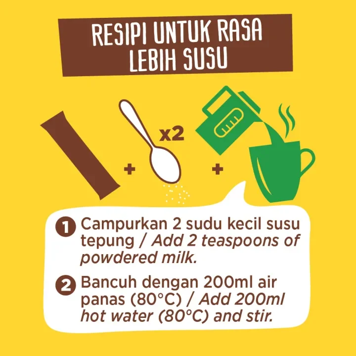 Just mix 1 sachet of MILO® Original with 200ml hot/warm water into a cup. For milkier taste, add 2 teaspoons of milk powder.