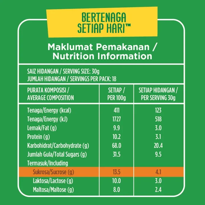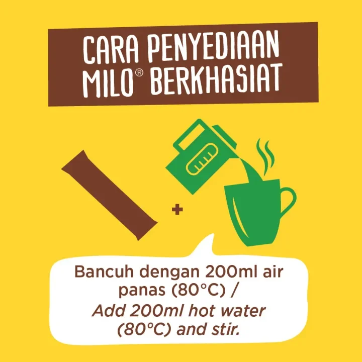 Dapatkan serbuk MILO® kegemaran anda di mana sahaja anda mahu dengan MILO® Original Stik Pek! Mulakan hari anda dengan bertenaga dengan MILO® yang mengandungi kebaikan semula jadi barli malt, susu, serbuk koko, vitamin dan mineral penting, dengan hanya ~1 sudu teh gula tambahan (sukrosa) setiap hidangan.